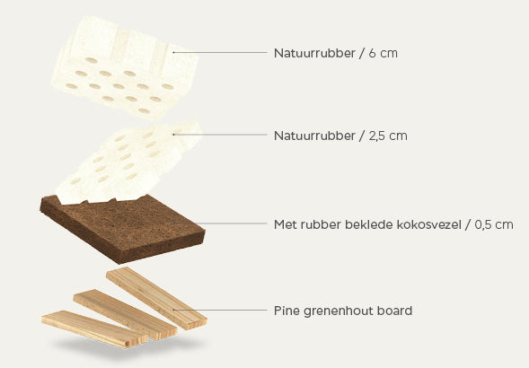 Natuurlijke materialen: Natuurlijk rubber, elastische kokosvezel, dennenhout