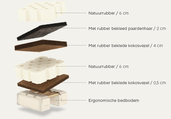 Natuurlijke materialen: Natuurlijk rubber, elastische kokosvezel, paardenhaar, ergo base