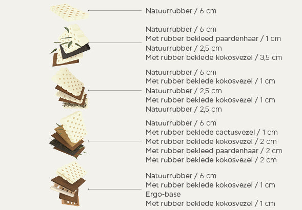 Natuurlijke materialen: Natuurlijk rubber, elastische kokosvezels, elastisch paardenhaar, elastische cactusvezels, massief eikenhout, zeegras, eucalyptus