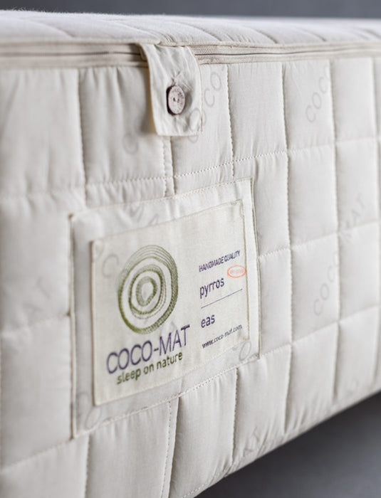 De Pyrros bedbodem heeft drie lagen natuurlijk rubber, drie lagen elastische kokosvezel en een tussenlaag van gedroogd zeegras.
