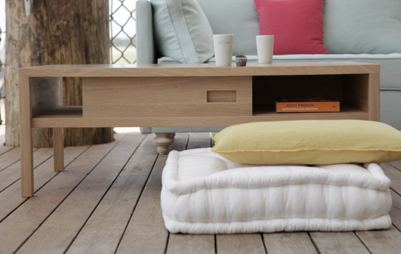 Een minimalistisch ontwerp voor een uitzonderlijk functionele tafel in de woonkamer, omdat de onderste plank een 'verdubbeling' van het functionele oppervlak mogelijk maakt.
