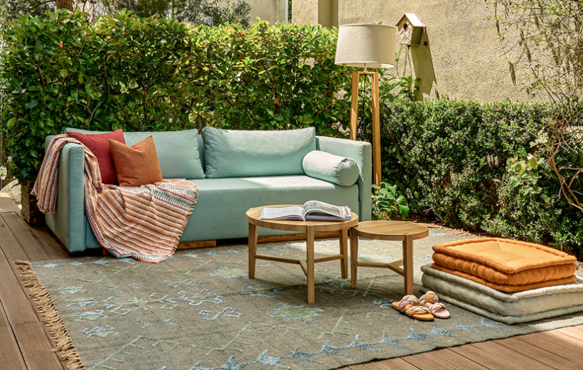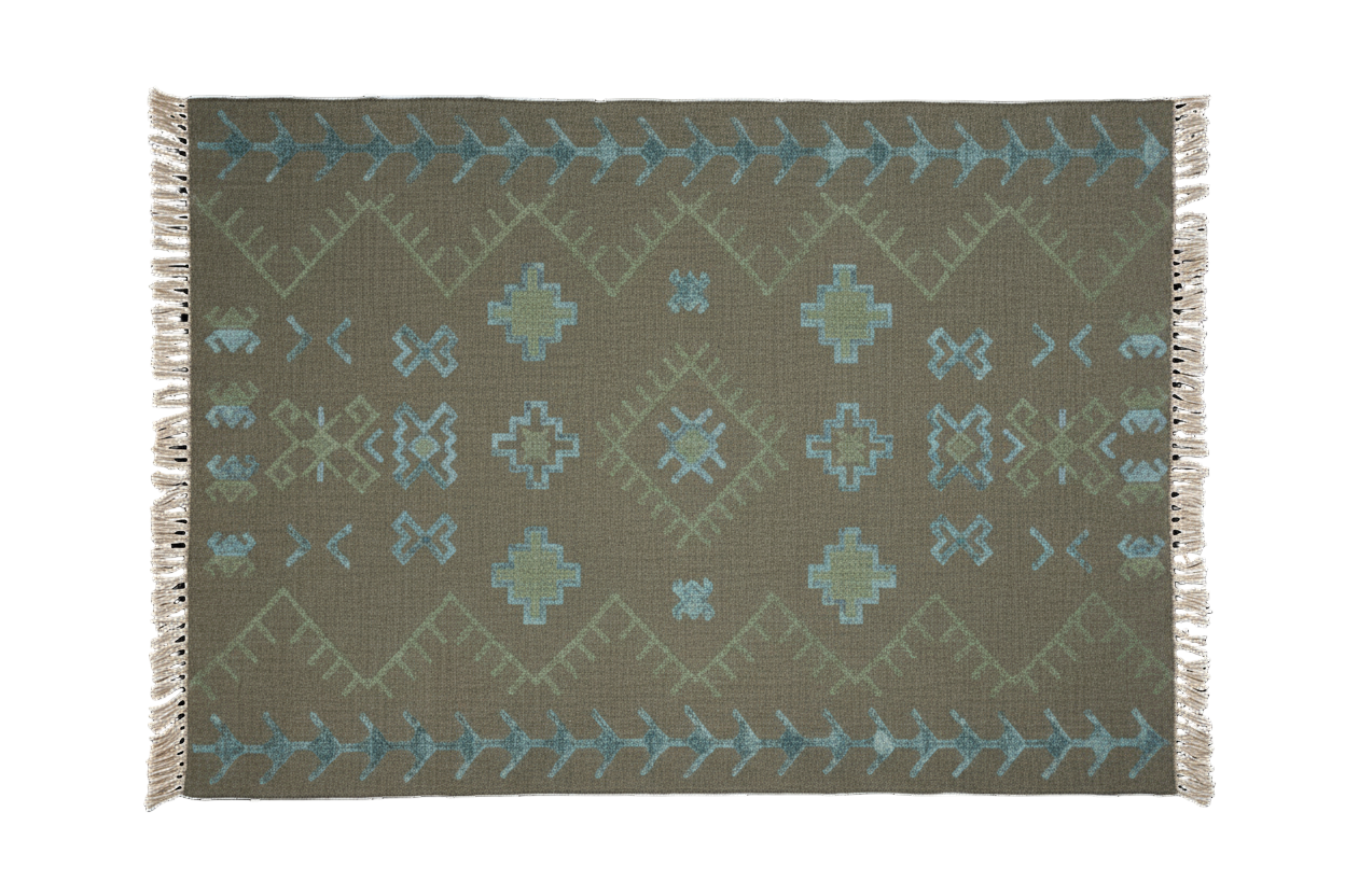 Een mix van blauw- en groentinten met etnische patronen, geschikt voor ruimtes met een uitgesproken esthetiek.