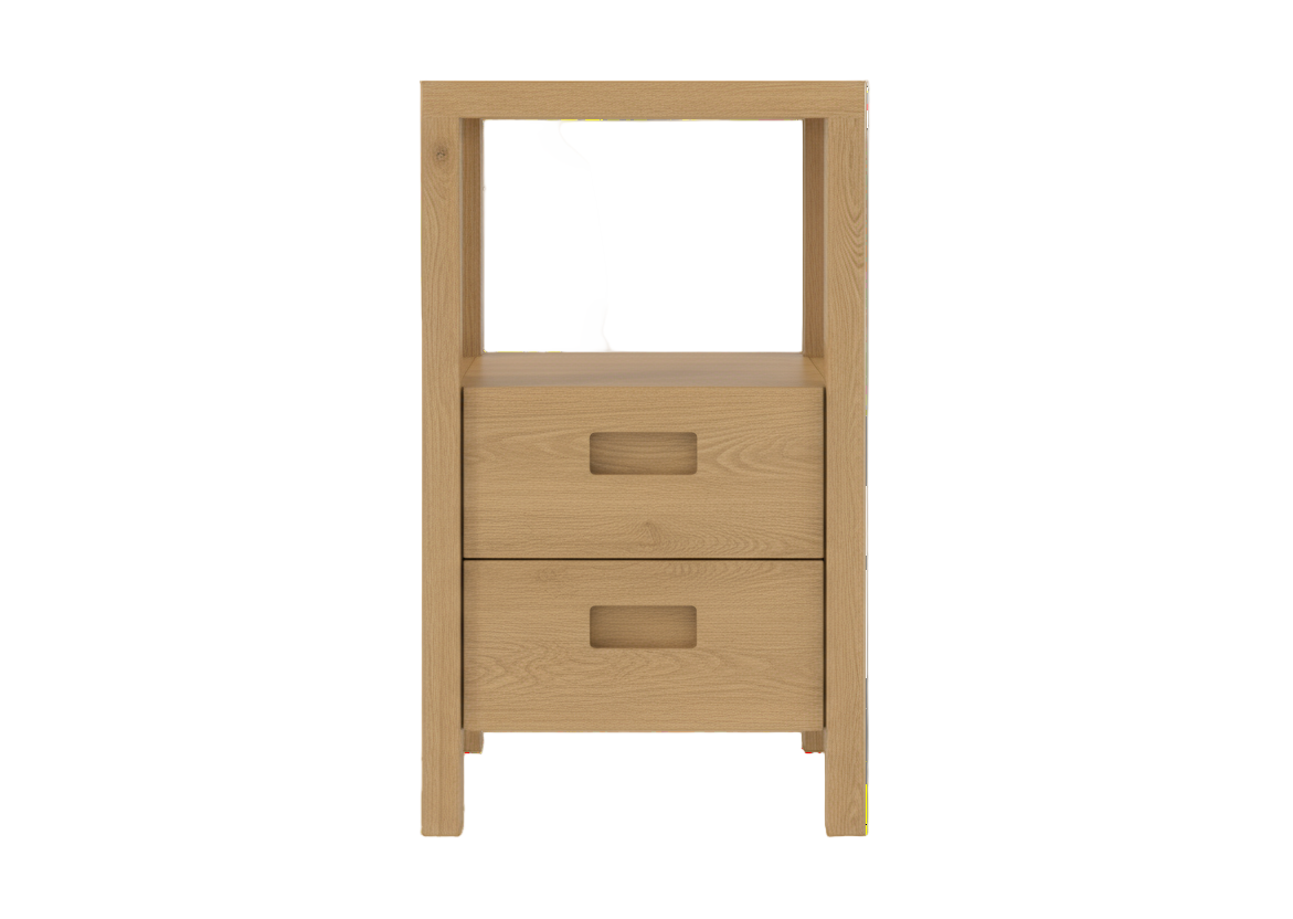 Het Dalida III nachtkastje heeft twee praktische lades en een bovenste plank. Het ontwerp is eenvoudig en laat de natuurlijke elegantie van massief hout zien. Het heeft een speciaal mechanisme voor soepel en geruisloos sluiten. Afgewerkt met vernis op waterbasis.