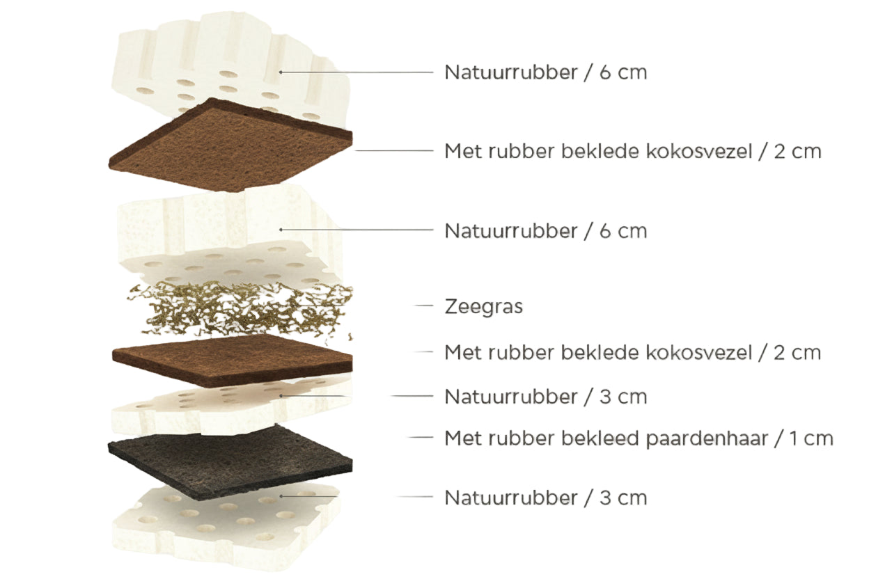 - Materiaal: Natuurlijk rubber, elastische kokosvezels, paardenhaar
