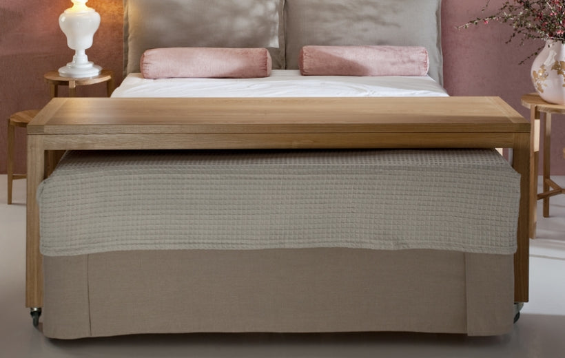 Let op: met wielen is de totale hoogte 85,5 cm, terwijl de hoogte tot het tafelblad 75 cm is. Controleer daarom goed of er voldoende ruimte is onder de tafel voor je benen wanneer je de tafel over je bed wilt schuiven. Wielen kunnen eraf gedraaid worden.